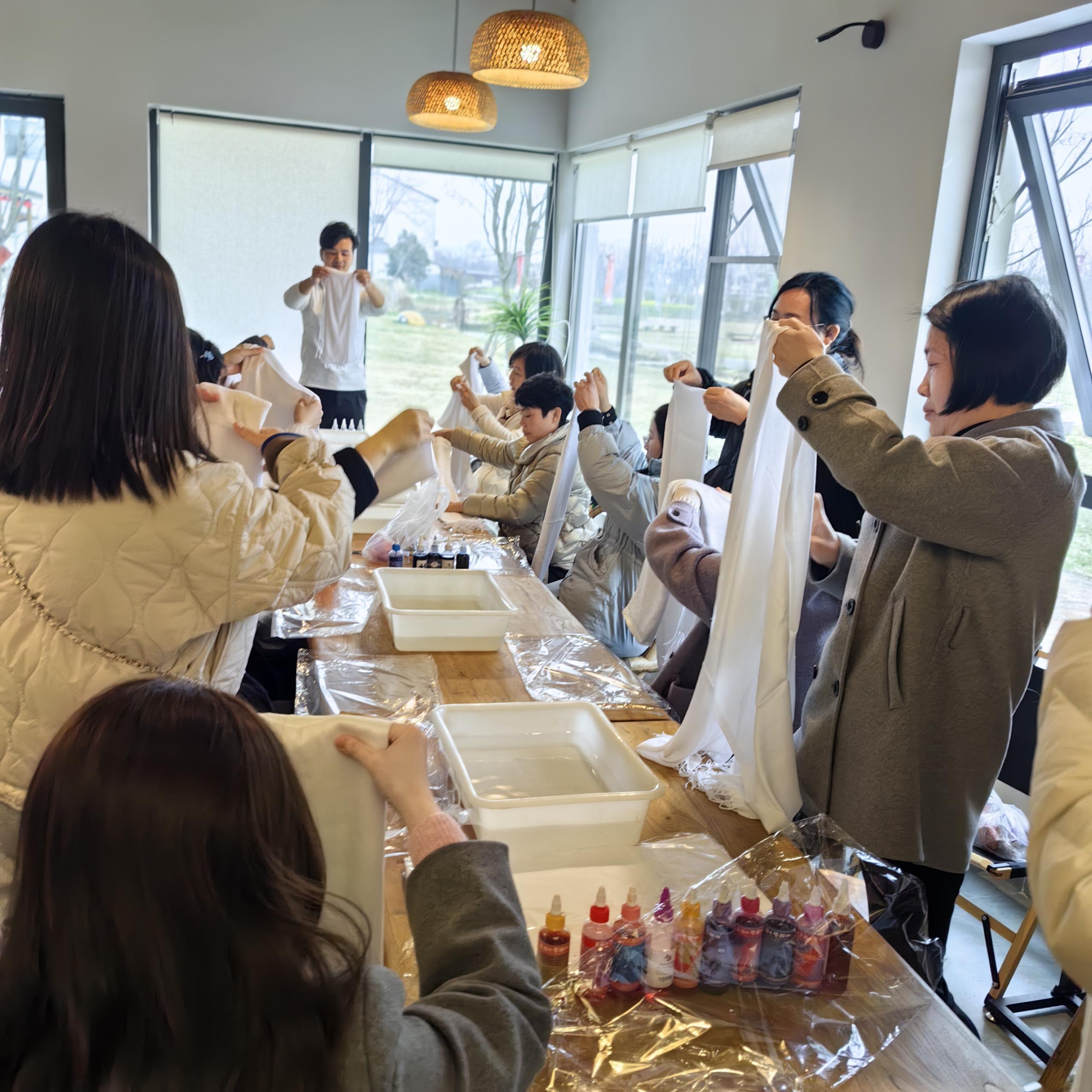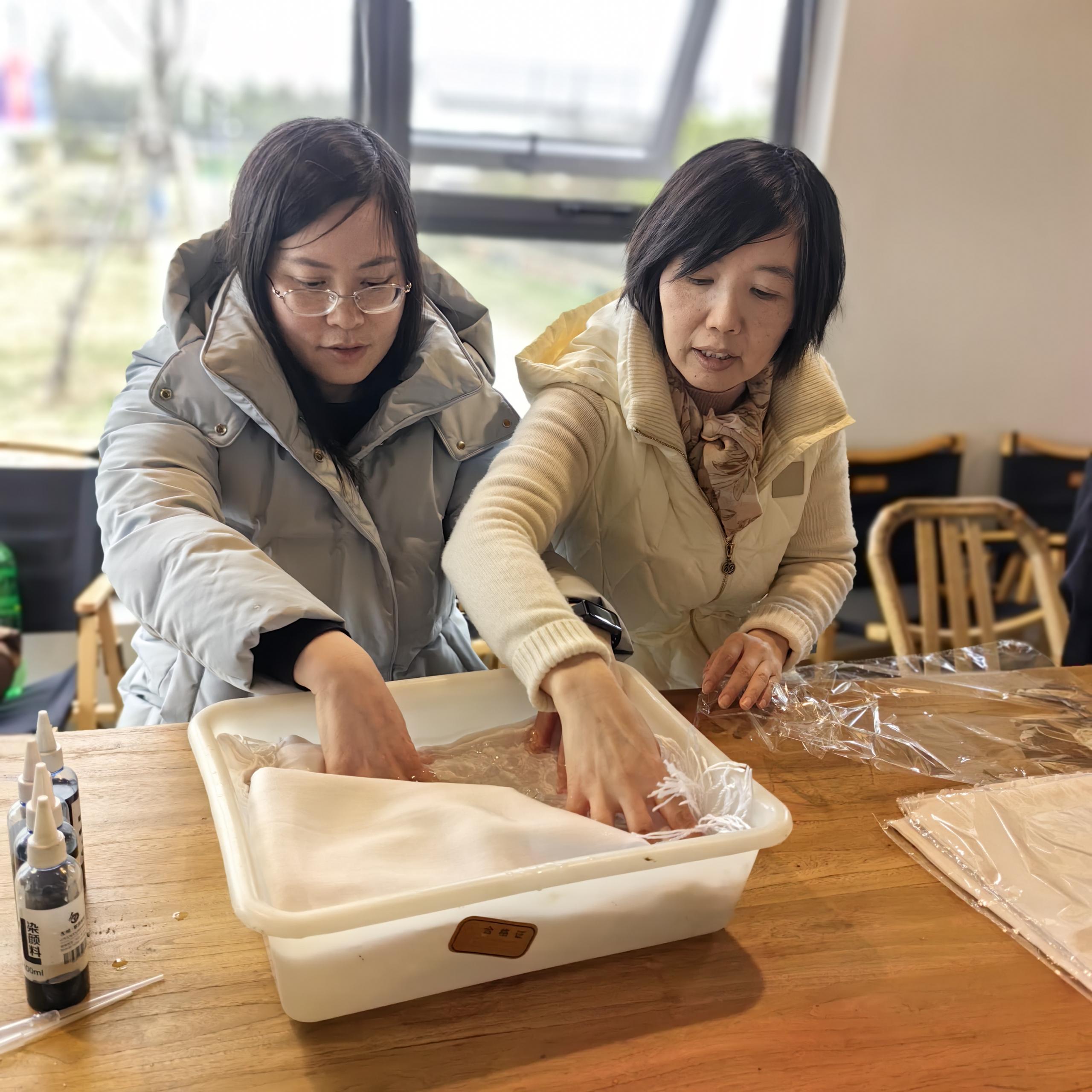 午餐后,大家移步至雅致的休憩区,品味香醇的现磨咖啡与精致茶点,在咖啡的醇香中沉淀心情。随后进行的非遗围巾扎染体验环节将活动推向了高潮。在专业老师的悉心指导下,女教职工们化身“匠心手艺人”,亲手体验了传统扎染工序。一方方各色围巾在老师们巧妙的构思与创作下,逐渐绽放出独一无二的纹样,每一件作品都凝聚了创造者的巧思与对美的感悟,成为节日里最特别的纪念。
